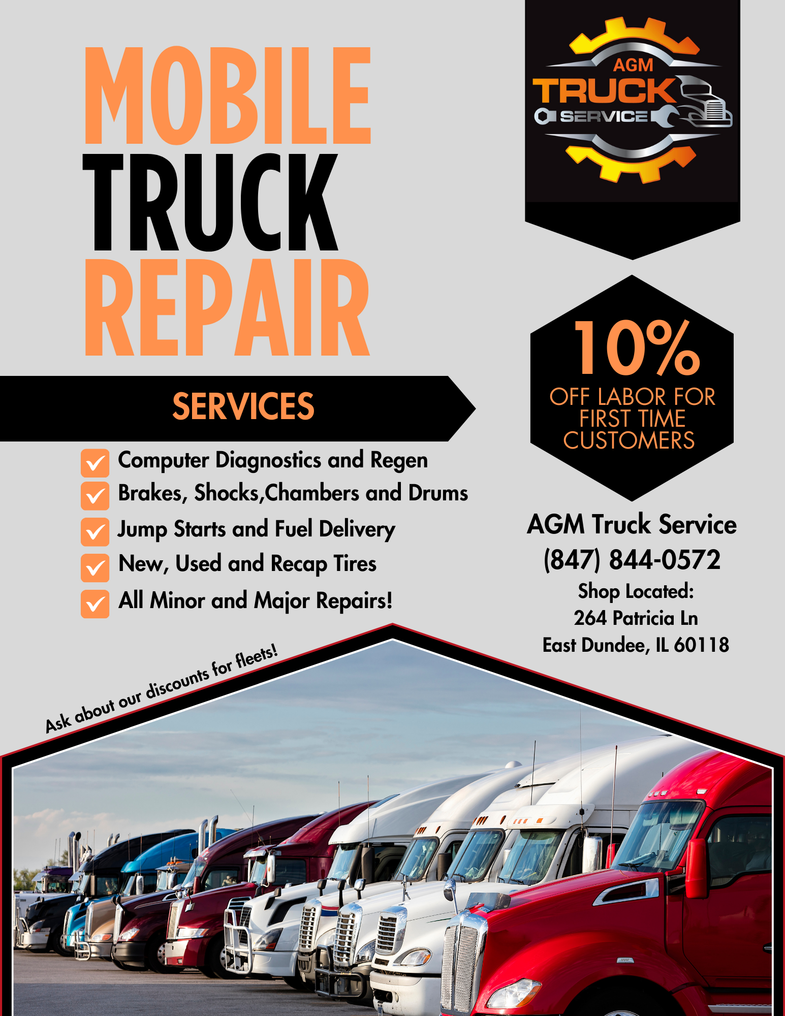 AGM Truck Service is proud to provide exceptional mobile truck and trailer services tailored to simplify your life. With our mobile service, there's no need for you to transport your truck to us; we bring our expertise right to your location, saving you valuable time and effort. Our dedicated team is committed to delivering swift and dependable service, so you can rest assured that your truck will be back on the road, causing minimal disruption to your business operations.